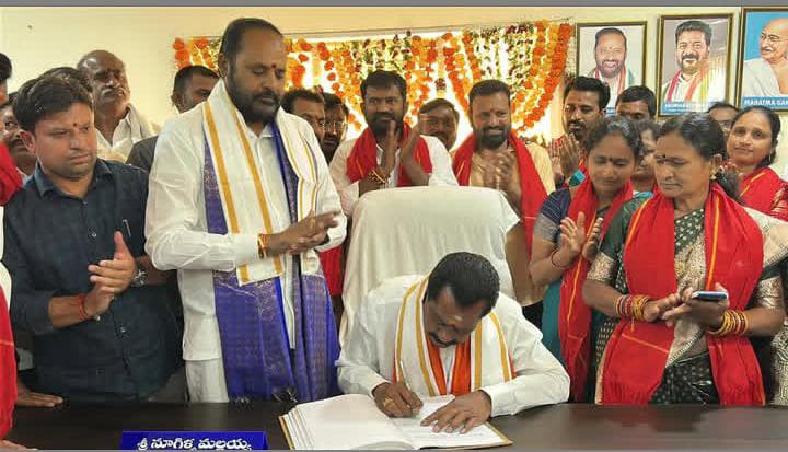 అందరి సహకారంతో పెద్దపల్లి పట్టణాన్ని మరింత అభివృద్ధి చేయడం కోసం కృషి చేస్తామని మున్సిపల్చైర్మన్ నూగిళ్ళ మల్లయ్య అన్నారు. బుధవారం మున్సిపల్ కార్యాలయంలో ఎమ్మెల్యే విజయ రమణారావు సమక్షంలో చైర్మన్ గా బాధ్యతలను స్వీకరించారు. ముందుగా చైర్మన్ చాంబర్లో వేదపండితుల సమక్షంలో ప్రత్యేక పూజలను నిర్వహించారు. అనంతరం చైర్మన్, వైస్చైర్మన్ బాధ్యతలు స్వీకరించారు. ఈ సందర్భంగా ఎమ్మెల్యే నూతన పాలక వర్గానికి శుభాకాంక్షలు తెలిపి, చైర్మన్, పాలకవర్గం కలిసికట్టుగా పనిచేసి పట్టణ అభివృద్ధికి కృషి చేయాలని, ప్రజా సమస్యల పరిష్కారానికి అందుబాటులో ఉండాలని సూచించారు. ఈ సందర్భంగా పెద్దపల్లి మున్సిపల్ చైర్మన్ నూగిళ్ళ మల్లయ్య మాట్లాడుతూ చైర్మన్ పదవికి అవకాశం ఇచ్చిన ఎమ్మెల్యే చింతకుంట విజయ రమణారావుకి ఆదరించి ఓటేసి ఆశీర్వదించినందుకు పట్టణ ప్రజలకు కృతజ్ఞతలు తెలిపారు. బాధ్యతలను అప్పగించిన విజన్నకు రుణపడి ఉంటామన్నారు. ఎమ్మెల్యే సహకారంతో పట్టణాన్ని అభివృద్ధి చేస్తామన్నారు. పట్టణంలో సామాన్య రైతు కుటుంబంలో పుట్టి పెరిగాను. ఇక్కడి రోడ్ల మీద నడిచాను, కంచెర బావి నీళ్లు తాగి పెరిగినవాడినని, ఇక్కడి సమస్యలను దగ్గరగా చూశానన్నారు. అందుకే ఈ పదవిని ‘అధికారం’గా కాకుండా, సేవ చేసే అవకాశంగా భావిస్తున్నానని తెలిపారు. పట్టణంలో ఇంకా చాలా మెరుగుపరచాల్సిన అంశాలు ఉన్నాయని వాటి అన్నిటిని ఎమ్మెల్యే సహకారంతో పరిష్కారం చేస్తానని హామీ ఇచ్చారు. ప్రతి ఇంటికి శుభ్రమైన తాగునీరు, మంచి డ్రైనేజీ వ్యవస్థ, పక్కాగా తడి, పొడి చెత్త అమలు, రోడ్లు, వీధుల దీపాలు, పార్కుల అభివృద్ధి, మెరుగైన ఆరోగ్యం, విద్యా సౌకర్యాలు, యువతకు ఉపాధి అవకాశాలు, స్వచ్ఛతకు పెద్దపీట వేస్తా అన్నారు. ప్రజల నమ్మకాన్ని ఎప్పటికీ వమ్ము చేయనని, పారదర్శకంగా, నిజాయితీగా, పక్షపాతం లేకుండా అందరికీ సమానంగా పనిచేస్తానని తెలిపారు. బాధ్యతలను స్వీకరించిన చైర్పర్సన్, వైస్చైర్మన్ను తోటి కౌన్సిలర్లు, అధికారులు సిబ్బంది, కాంగ్రెస్ నాయకులు, మాజీ కౌన్సిలర్లు, పట్టణ నాయకులు సన్మానించి శుభాకాంక్షలు తెలిపారు. ఈ కార్యక్రమంలో మున్సిపల్ కమిషనర్ ఆకుల వెంకటేష్,వైస్ చైర్మన్ ముస్కాన్ నాజ్,సుల్తానాబాద్ మార్కెట్ కమిటీ చైర్మన్ మినుపాల ప్రకాష్ రావు, నూతనంగా ఎన్నికైన మున్సిపల్ కౌన్సిలర్లు, కాంగ్రెస్ కార్యకర్తలు పాల్గొన్నారు.