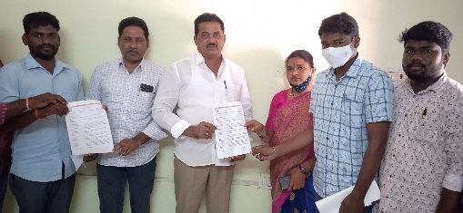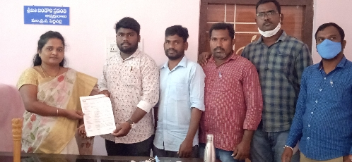పెద్దపెల్లి జడ్పిటిసి బండారి రామ్మూర్తి మరియు  ఎంపిఓ సుదర్శన్ లకు ,వినతి పత్రం అందిస్తున్న పంచాయతీ కార్యదర్శులు.