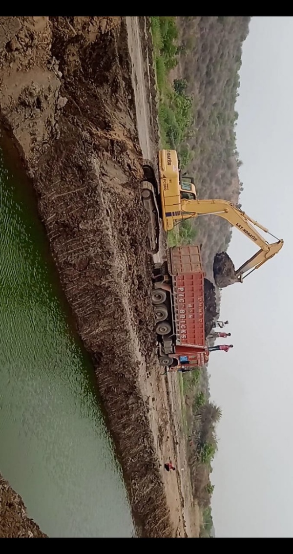…. చెరువు పక్కనే ఉన్న గుట్టను జెసిపితో తవ్వుతూ ట్రాక్టర్ల ద్వారా మట్టిని చెరువులో దారి కోసమంటూ పోస్తున్నారు. అదేవిధంగా చెరువులోని మట్టిని బట్టీలకు నిబంధనలకు విరుద్ధంగా1.5 మీటర్ల లోతు కంటే ఎక్కువగా తోడుతూ తరలిస్తున్నారు……