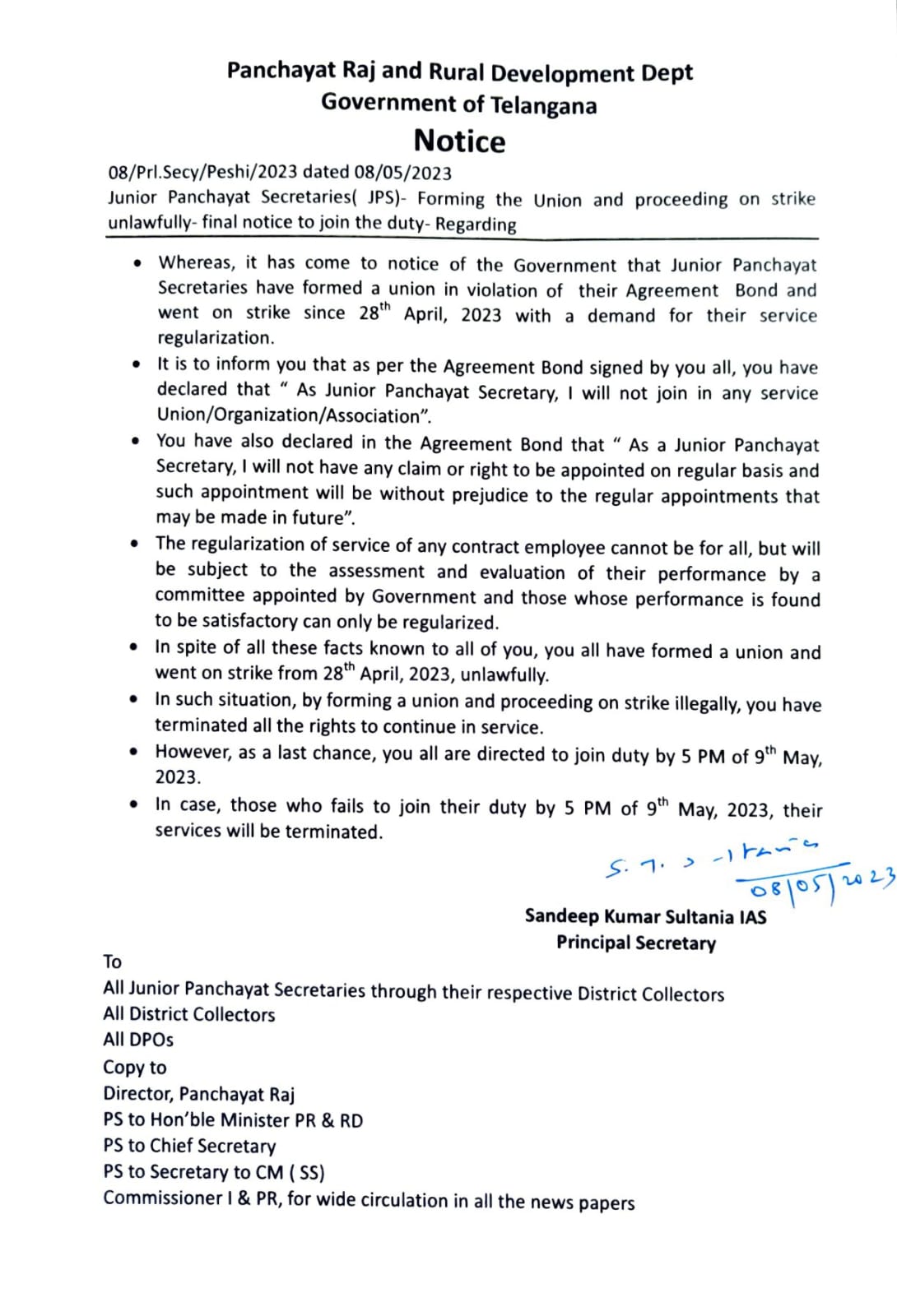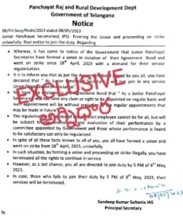 అగ్నిధార న్యూస్ ( హైదరాబాద్ ) గత నెల 28 తేదీ నుండి తమ సర్వీస్ రెగ్యులర్ చేయాలని డిమాండ్ చేస్తూ జూనియర్ పంచాయతీ కార్యదర్శుల సంఘం ఆధ్వర్యంలో రాష్ట్రవ్యాప్తంగా ఉన్న జూనియర్ పంచాయతీ కార్యదర్శులు సమ్మె బాట పట్టారు తమ న్యాయమైన డిమాండ్లను నెరవేర్చాలని ప్రభుత్వానికి సమ్మె ద్వారా నిరసన తెలుపుతూ రిలే నిరాహార దీక్షలు చేపట్టారు. కానీ జూనియర్ పంచాయతీ కార్యదర్శులకు ఊహంచని విధంగా ప్రభుత్వం నుండి తేదీ 8 05 2023 రోజున ప్రిన్సిపాల్ సెక్రటరీ సందీప్ కుమార్ సుల్తానియా అన్ని జిల్లా కలెక్టర్లకు డిపిఓల ద్వారా నోటీస్ జారీ చేశారు. ఈనెల తొమ్మిది సాయంత్రం ఐదు గంటల లోపు జూనియర్ పంచాయతీ కార్యదర్శులు సమ్మె విరమించి వీధుల్లో చేరాలని హెచ్చరించారు. ఆ నోటీసులో 9 మే 2023 సాయంత్రం ఐదు గంటల వరకు విధుల్లో చేరని పంచాయతీ కార్యదర్శులను వారి వారి సర్వీసుల నుండి తొలగించబడుతుందని హెచ్చరించారు.