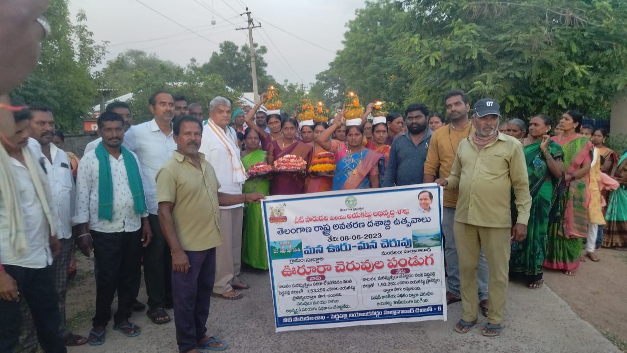 సుల్తానాబాద్ మండల కేంద్రంలోని సుద్దాల గ్రామంలో తెలంగాణ దశాబ్ది ఉత్సవాల్లో భాగంగా ఊరూర చెరువుల పండుగ కార్యక్రమాన్ని ఘనంగా జరుపుకున్నారు. ఈ సందర్భంగా రైతు సమన్వయ కమిటీ జిల్లా అధ్యక్షుడు కాసర్ల అనంతరెడ్డి మాట్లాడుతూ ఒకప్పుడు కాలువల మరమ్మత్తు సరిగ్గా లేకపోవడం వల్ల లక్షల ఎకరాల ఆయకట్టు ప్రాజెక్టుల ద్వారా సాగు అయ్యేది కాదు దీనివల్ల చెరువులు మరియు వాగులు అభివృద్ధికి నోచుకోక వ్యవసాయదారులు పశు పెంపకం దారులు అనేక అవస్థలు పడేవారు. తెలంగాణ వచ్చాక మిషన్ కాకతీయ పథకం ద్వారా కాలువలు చెరువులు మరమ్మత్తులు చేపట్టి చెరువులు పూడికలు తీసి కుంటల నీటి నిలువ సామర్థ్యాన్ని పెంచి చెరువు కట్టను బలోపేతం చేశారు. క్రాస్ డ్రైనేజీ స్ట్రక్చర్లను మరమ్మత్తు చేయడం ద్వారా చెరువులోని పెరిగిన తుమ్మ చెట్లను నరికి వేయడం గుర్రపు డెక్క లొట్టపీసు మొక్కలు తొలగించి గొలుసు కట్టు చెరువులను అభివృద్ధి చేశారు. గొలుసు కట్టు చెరువులను బాగు చేసుకోవడం ద్వారా తొలగించిన పూడిక మట్టిని రైతుల పంట పొలాల్లో పోయడం ద్వారా రైతులు హర్షం వ్యక్తం చేశారని తెలిపారు. ఇలా అభివృద్ధి చేసిన చెరువులలో మత్స్యకారులు కూడా అనేక లాభాలు గడించారని ఆయన తెలిపారు. ఈ కార్యక్రమంలో గ్రామ సర్పంచి అంజలీదేవి, గ్రామ కార్యదర్శి మహేందర్ యాదవ్, గ్రామ సీఏ జ్యోతి, మత్స్యకారులు గరిగంటి రవి, సదయ్య, తాడవేణి సంపత్, బిఆర్ఎస్ నాయకులు దూడం సతీష్, బొంకూరి సదయ్య, న్యాతరీ పోశాలు తదితరులు పాల్గొన్నారు.