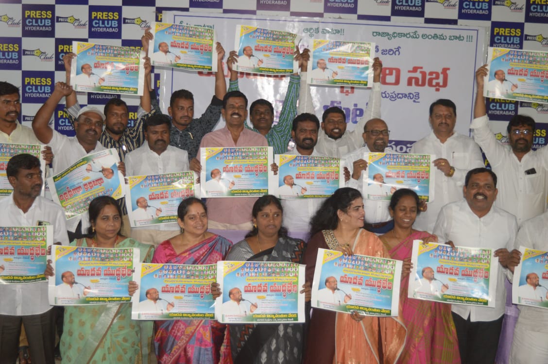 రానున్న సార్వత్రిక ఎన్నికల్లో తెలంగాణ రాష్ట్రంలో జనాభా ప్రాతిపదికన అన్ని రాజకీయ పార్టీలు యాదవులు, యాదవ ఉపకులాలకు 22 ఎమ్మెల్యే, 7 ఎమ్మెల్సీ, 5 లోకసభ, రాజ్యసభ సీట్లు ఇవ్వాలని డిమాండ్ చేస్తూ ఆగస్టు 13 న హైదరాబాద్ లోని సరూర్ నగర్ గ్రౌండ్ లో నిర్వహించే యాదవ యుద్ధభేరిని జయప్రదం చేయాలని యాదవ విద్యావంతుల వేదిక రాష్ట్ర అధ్యక్షులు చలకాని వెంకట్ యాదవ్ అన్నారు. మంగళవారం సోమాజిగూడ ప్రెస్ క్లబ్ లో నిర్వహించిన విలేకరుల సమావేశంలో యుద్ధభేరి పోస్టర్ ని ఆయన ఆవిష్కరించి మాట్లాడారు. పాలకవర్గ పార్టీలు గొర్రెలు, బర్రెలు, ఆవుల పేర్లు చెప్పి యాదవులను జీవాల కాపర్లుగా పరిమితం చేసి, కుల వృత్తుల చట్రంలో ఇరికించజూస్తున్నారన్నారు. రేపటి యాదవ తరాలను చదువులకు దూరం చేసే కుట్ర తెలంగాణాలో జరుగుతుందన్నారు. కుల వృత్తులకు పరిమితమైతే చదువులు, ఉద్యోగాలు, అధికారానికి దూరం కావాల్సి వస్తుందని ఆయన అన్నారు. అందుకే సీట్ల వాటా, ఆర్ధిక వాటా, రాజ్యాధికారమే అంతిమబాటగా నినదించాల్సిన సమయం ఆసన్నమైందన్నారు. అందుకే యాదవులు గొర్రెల కోసం కాకుండా సీట్ల కోసం గొంతెత్తాలని, ఏ రాజకీయ పార్టీ మాయమాటలకు లోనవకుండా జాగ్రత్తతో వ్యవహరించాలన్నారు. కాబట్టి రానున్న ఎన్నికల్లో ఏ రాజకీయ పార్టీ ఎన్నికల ఎత్తులకు జిత్తులకు లోనవకుండా, ఒక్కపార్టీకి ఫాలోవర్లుగా మిగిలిపోకుండా యాదవులు అత్యంత ప్రజాస్వామికంగా వ్యవహరించాలని, యాదవుల జనాభాకు తగిన సీట్లు ఇవ్వని పార్టీలకు ఓట్లేయబోమని తిరగబడాలని పిలుపునిచ్చారు. రాజకీయాలలో యాదవులు ఓట్లేయడమే కాదు, పోటీ చేయడంలో కూడా కీలకంగా ఉండాలన్నారు. అందుకోసం పోటీ చేయాలనుకునే వారు ఆత్మ విశ్వాసంతో, ఆత్మగౌరవంతో ఆయా పార్టీలను సీట్లు అడగాలని, జెండాలు మోసే బానిసలుగా ఇక మీదట ఉండొద్దని ఆయన హితవు పలికారు. ఎన్నికల వేళ బిసి రాగం వలకబోస్తున్న పాలక పార్టీలు జనాభా ప్రాతిపదికన యాదవులకు, ఆయా కులాలకు ఎన్ని సీట్లు ఇస్తారో ప్రకటించాలని డిమాండ్ చేశారు.