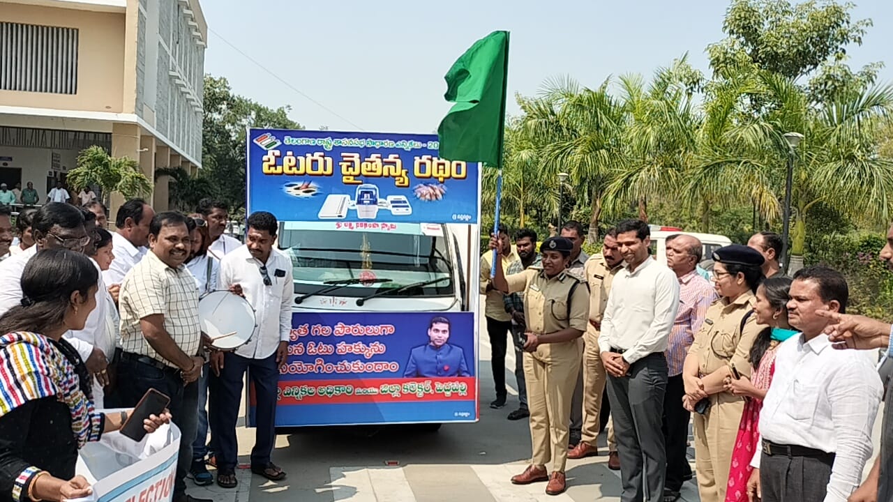 సోమవారం సమీకృత జిల్లా కలెక్టరేట్ కార్యాలయంలో తెలంగాణ రాష్ట్ర శాసనసభ సాధారణ ఎన్నికలు -2023 సందర్భంగా స్వీప్ కార్యక్రమంలో భాగంగా ఓటర్ అవగాహన కొరకు ఏర్పాటు చేసిన ఓటరు చైతన్య రథాలను కలెక్టర్, జిల్లా ఎన్నికల అధికారి ముజమ్మిల్ ఖాన్ రామగుండం పోలీస్ కమిషనర్ రెమా రాజేశ్వరి, అదనపు కలెక్టర్ అరుణ శ్రీ లతో కలిసి జెండా ఊపి ప్రారంభించారు.