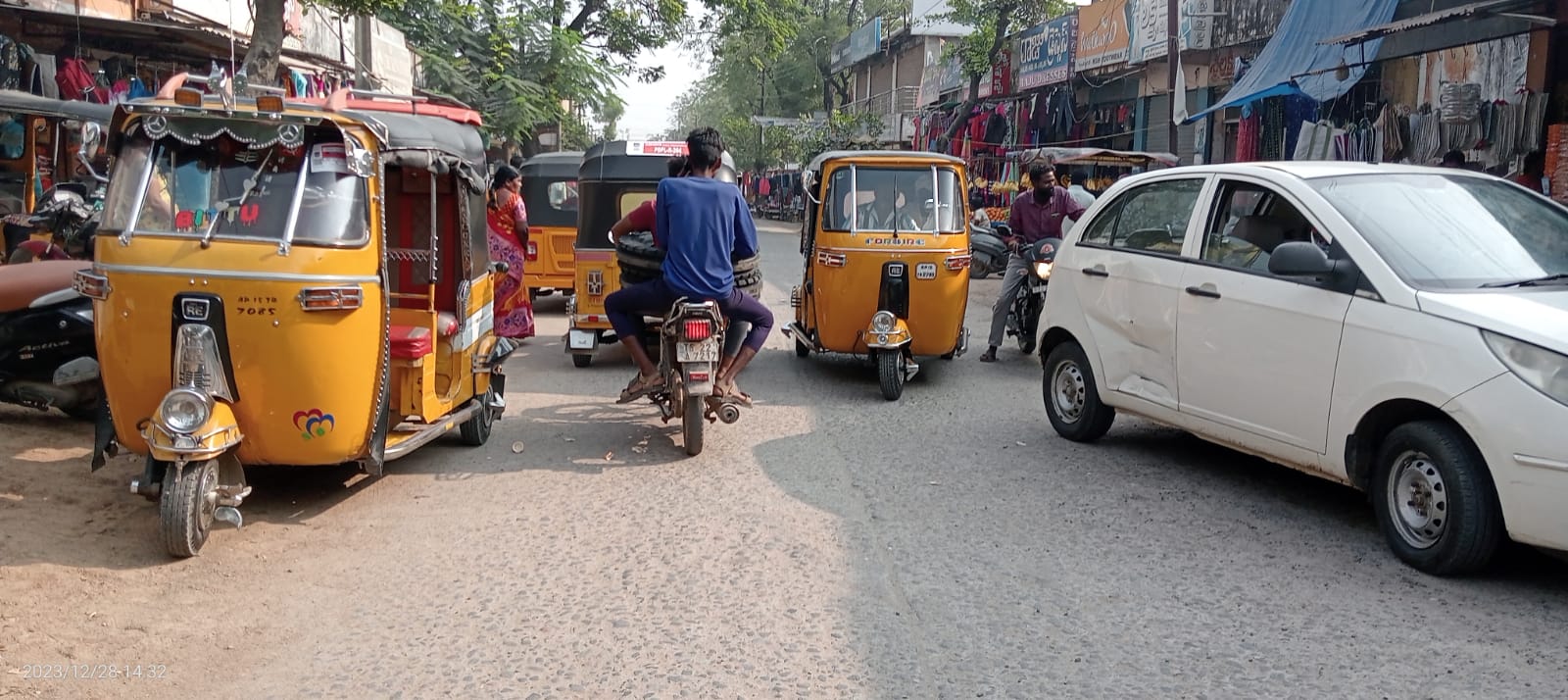 రోడ్లపైనే ఎక్కడబడితే అక్కడ నిలిచి ఉంచిన ఆటోలు, వాహనాలు.
