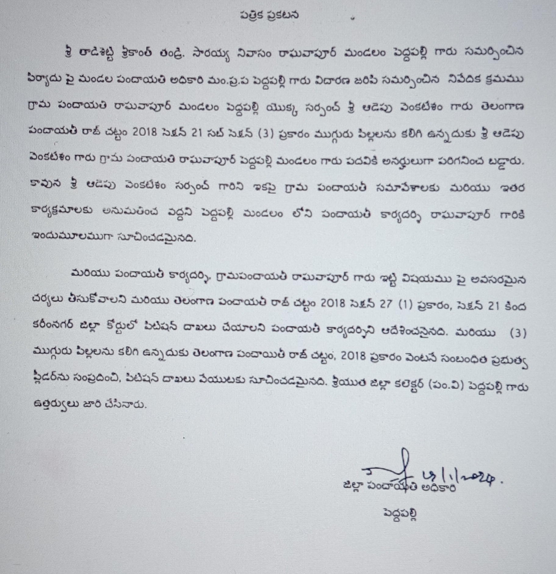 పెద్దపల్లి జిల్లా పెద్దపల్లి మండలం రాఘవపూర్ గ్రామ సర్పంచ్ ఆడపు వెంకటేశం తెలంగాణ పంచాయతీరాజ్ చట్టం 2018కి విరుద్ధంగా, ముగ్గురు పిల్లలు కలిగి ఉన్నారని, సర్పంచ్ పైన తాడిశెట్టి శ్రీకాంత్ ఫిర్యాదు చేయగా, విచారణ చేపట్టి అధికారులు, నివేదికను కలెక్టర్ కు సమర్పించారు. అధికారుల సమర్పించిన నివేదికల ఆధారంగా పంచాయతీ రాజ్ చట్టం 2018 ప్రకారం రాఘవపురం సర్పంచ్ ఆడపు వెంకటేశం సర్పంచ్ పదవికి అనర్హుడుగా ప్రకటిస్తూ..పెద్దపల్లి జిల్లా కలెక్టర్ ఉత్తర్వులు జారీ చేశారు.
