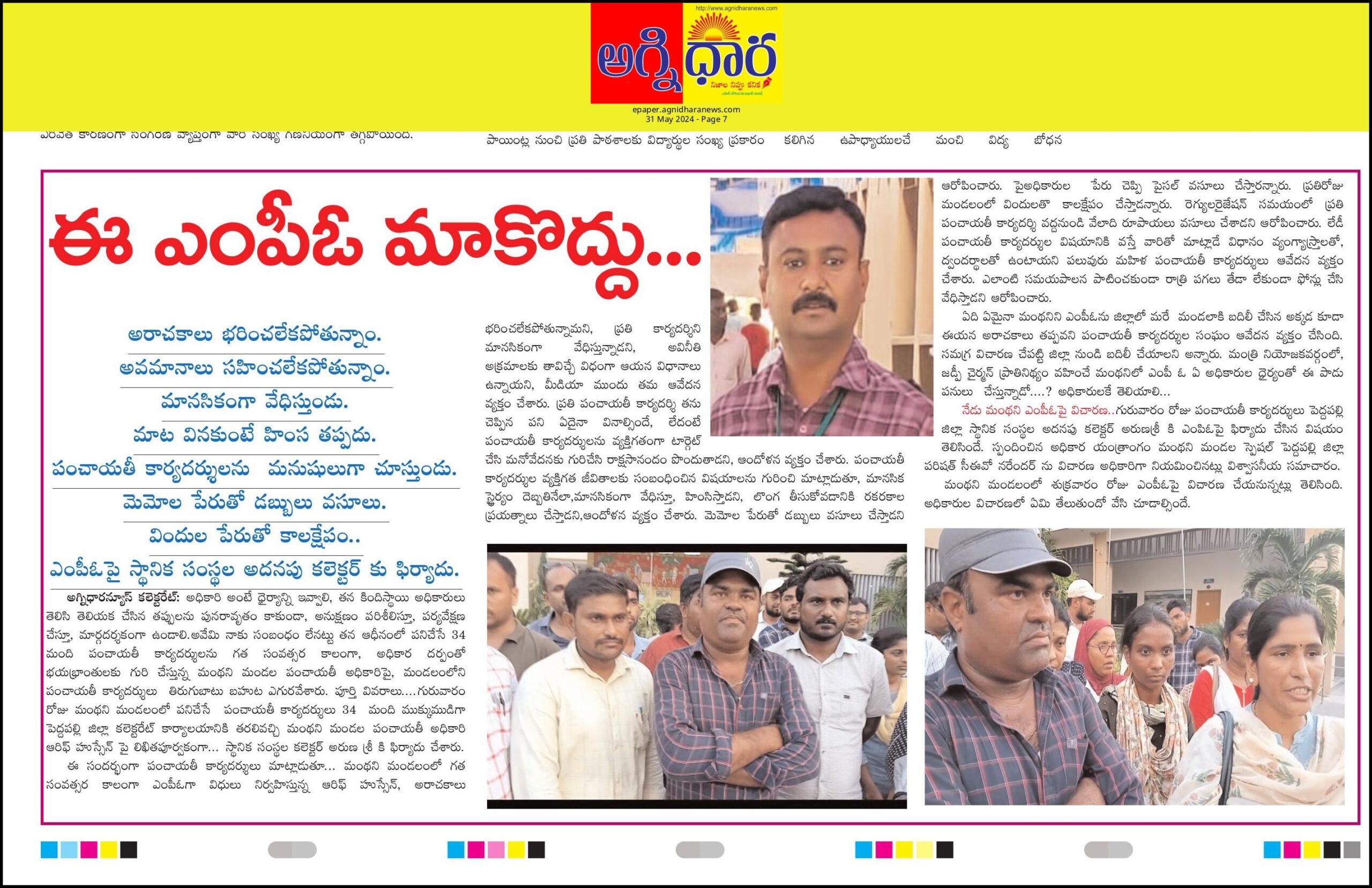 పెద్దపల్లి జిల్లా మంథని ఎంపీఓ ఆ మండల పంచాయితీ కార్యదర్శులను గురిచేసిన విధానాలపై విసిగి చెందిన మండల పంచాయతీ కార్యదర్శుల సంఘం అధ్యక్షుడు వేణు, నాయకులు సదయ్య, సాగర్ రావు,జిల్లా పంచాయతీ కార్యదర్శుల సంఘం అధ్యక్షుడు సంతోష్ జరిగిన ఘటనపై తీవ్ర ఆగ్రహం వ్యక్తం చేసిన విషయం తెలిసిందే. ఇంత బరితెగించి పంచాయతీ కార్యదర్శులను భయభ్రాంతులకు గురిచేసిన ఎంపీఓకు ….ఎవరి అండదండలు ఉన్నాయనే….? విషయంపై అనేక అనుమానాలు వ్యక్తమవుతున్నాయి. జిల్లా పంచాయతీ కార్యాలయంలో ఒకరిద్దరి అధికారుల అండదండలు మెండుగా ఉన్నాయనే గుసగుసలు వినిపిస్తున్నాయి. స్థానిక సంస్థల అదనపు కలెక్టర్ ఆవైపు దృష్టి సారిస్తే జిల్లాలోని ఆయా మండలాలలో జరిగే మరిన్ని విషయాలు వెలుగు చూసే అవకాశం ఉంటుందని పలువురు అంటున్నారు…..