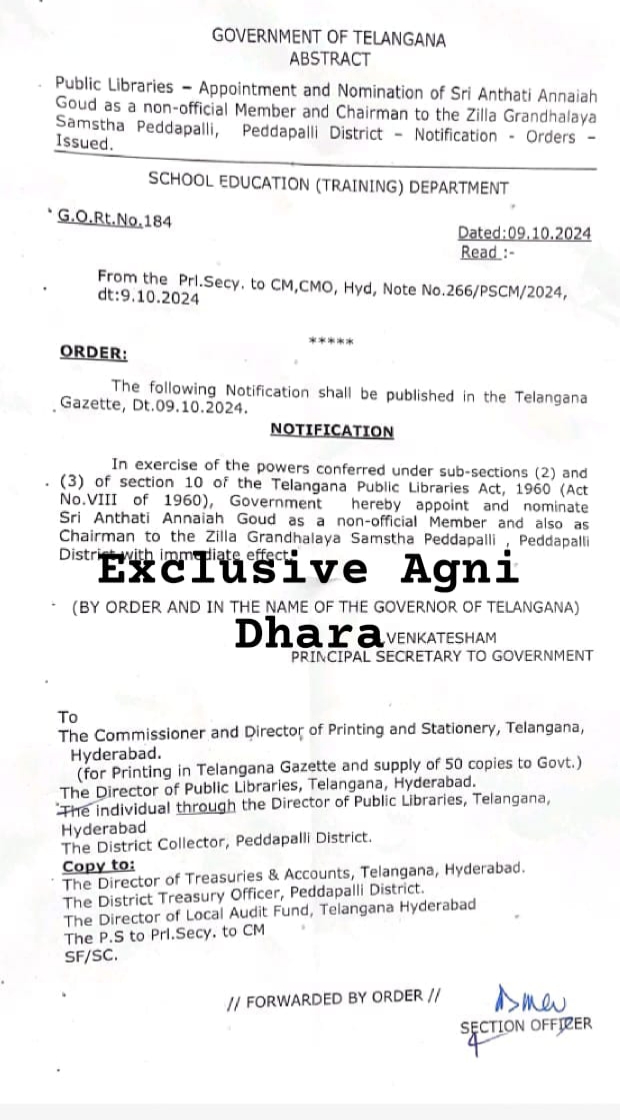 సుల్తానాబాద్ పట్టణానికి చెందిన కాంగ్రెస్ పార్టీ సీనియర్ నాయకులు సుల్తానాబాద్ మాజీ సర్పంచ్ అంతటి అన్నయ్య గౌడ్ ను పెద్దపల్లి జిల్లా గ్రంథాలయ చైర్మన్ గా ఈనెల తొమ్మిదో తేదీన నియమించినట్లు ప్రభుత్వంఉత్తర్వులు జారీ చేసింది. ఈ సందర్భంగా అన్నయ్య గౌడ్ మాట్లాడుతూ గ్రంథాలయ చైర్మన్ గా తన నియామకానికి సహకరించినందుకు మంత్రి శ్రీధర్ బాబుకు, పెద్దపల్లి ఎమ్మెల్యే చింతకుంట విజయ రమణారావు కు కృతజ్ఞతలు తెలిపారు.