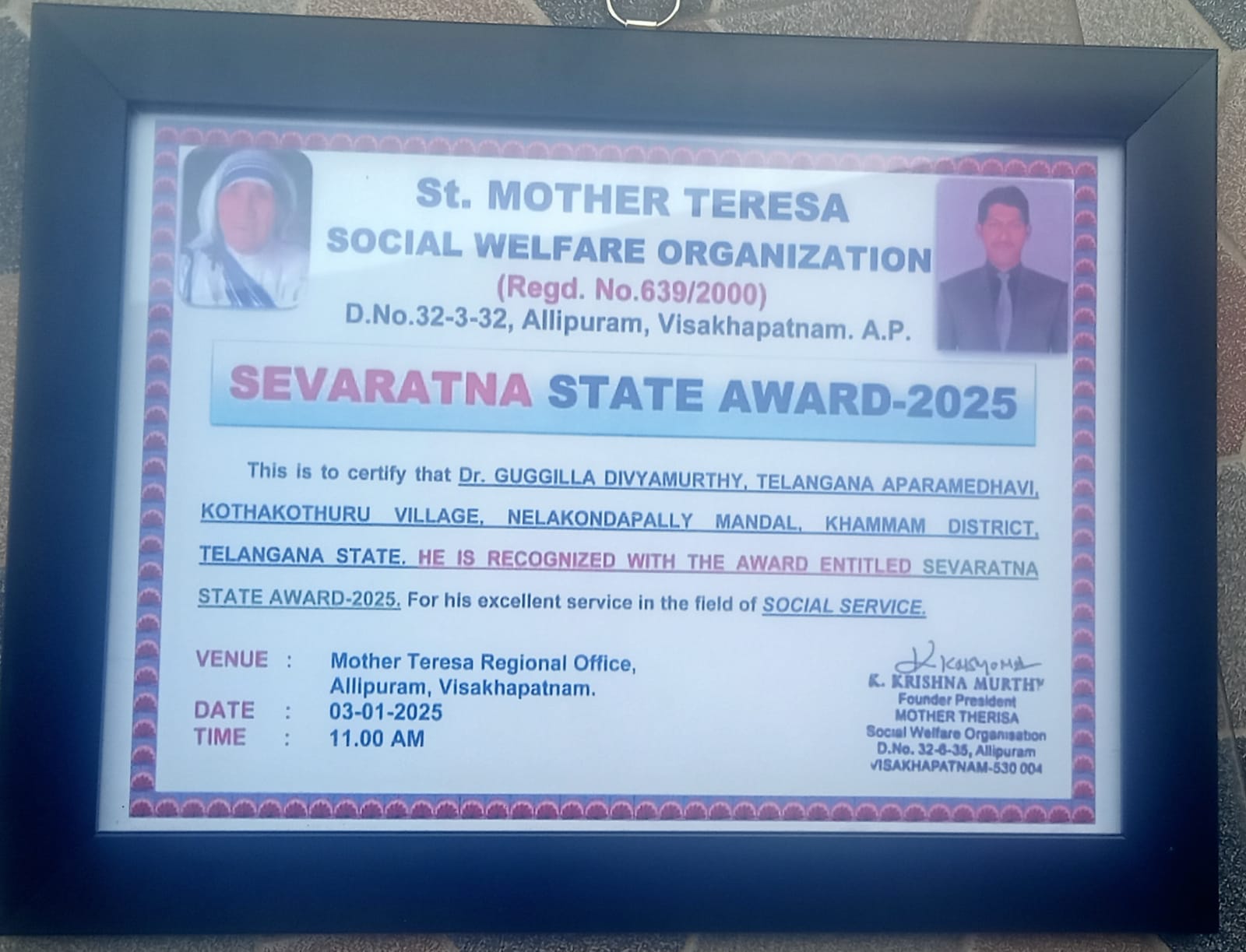 ఖమ్మంజిల్లా నేలకొండపల్లి మండలం కొత్తకొత్తూరు గ్రామానికి చెందిన అపర మేధావి డాక్టర్ గుగ్గిళ్ళ దివ్యమూర్తికి విశాఖపట్నం కి చెందిన సెయింట్ మదర్ థెరిస్సా ఆర్గనైజేషన్ సేవా రత్న అవార్డును ఇవ్వడం జరిగింది. దివ్యమూర్తి సమాజంలో చేస్తున్న అనేక సేవలకు గాను, మోటివేషనల్ స్పీచ్ లకు గాను ఈ అవార్డుకు ఎంపిక చేసినట్టు ఆర్గనైజేషన్ వారు తెలియజేశారు.ఈ అవార్డును డాక్టర్ గుగ్గిళ్ళ దివ్యమూర్తి ముదిగొండ మండల తహసిల్దార్ కార్యాలయంలో ముదిగొండ మండల తహసిల్దార్ కె. సునీత ఎలిజబెత్ చేతుల మీదుగా తీసుకోవడం జరిగింది. తదనంతరం డాక్టర్ దివ్యమూర్తిని తహసిల్దార్ దివ్యమూర్తి ఘనంగా సన్మానించడం జరిగింది.ఈ అవార్డు రావడం తనకు సంతోషంగా ఉందని డాక్టర్ దివ్యమూర్తి తెలియజేశారు. ఇప్పటివరకు తనకు 64 అవార్డులు వచ్చాయని, 109 చోట్ల సన్మానం జరిగిందని డాక్టర్ దివ్యమూర్తి తెలియజేశారు. ఈ కార్యక్రమంలో ముదిగొండ తహసిల్దారు సిబ్బంది మోహిద్ సుల్తానా, హారిక, రఫీ, సత్యానందం, అబ్బాస్, జానీ, నాగలక్ష్మి, ప్రసన్నకుమార్, తదితరులు పాల్గొన్నారు.